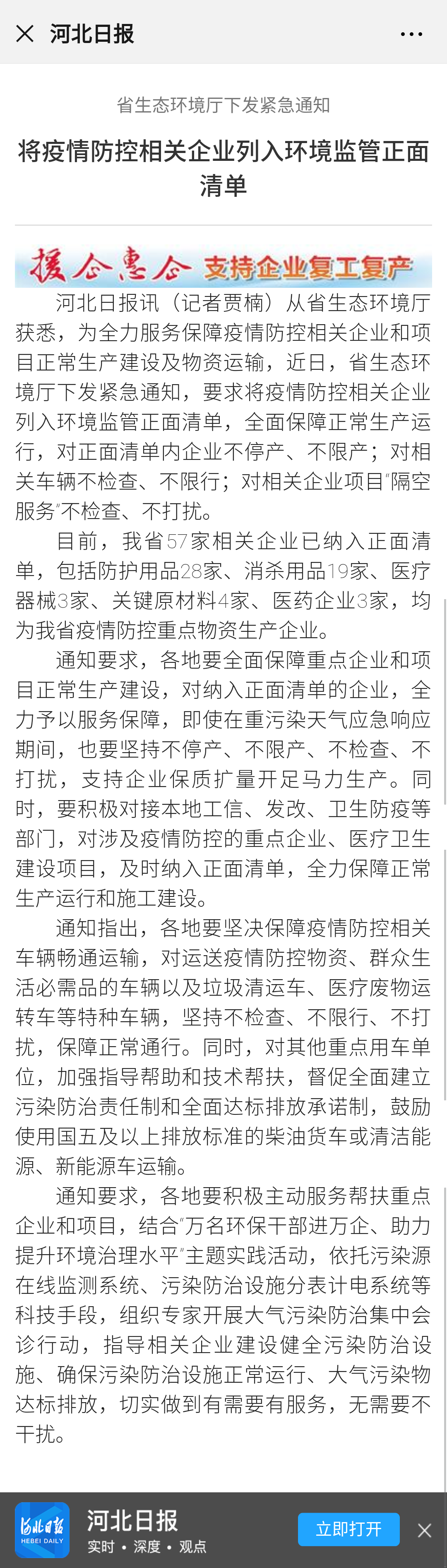 光明日报客户端:河北将疫情防控相关企业列入环境监管正面清单