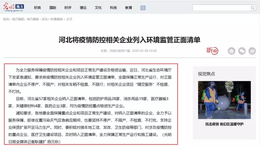 下发紧急通知,要求将疫情防控相关企业列入环境监管正面清单,全面保障正常生产运行,对正面清单内企业不停产、不限产;对相关车辆不检查、不限行;对相关企业项目“隔空服务”不检查、不打扰。