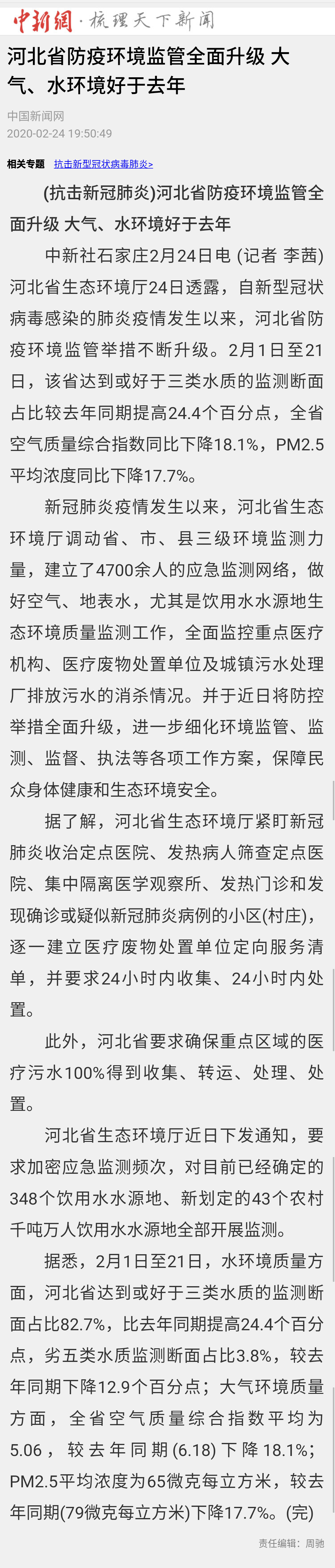 中国新闻网:河北省防疫环境监管全面升级 大气、水环境好于去年