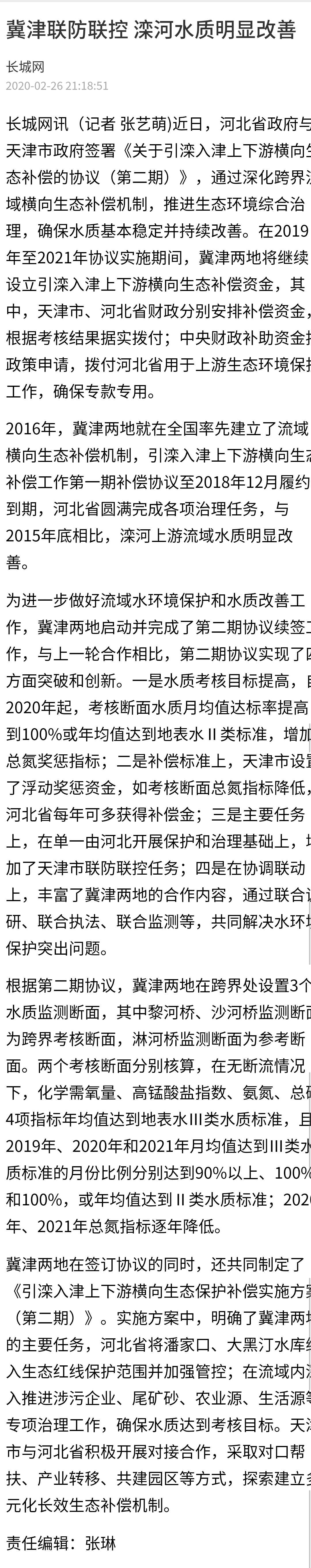 河北广播电视台冀时客户端:冀津引滦入津上下游横向生态补偿协议完成第二期续约
