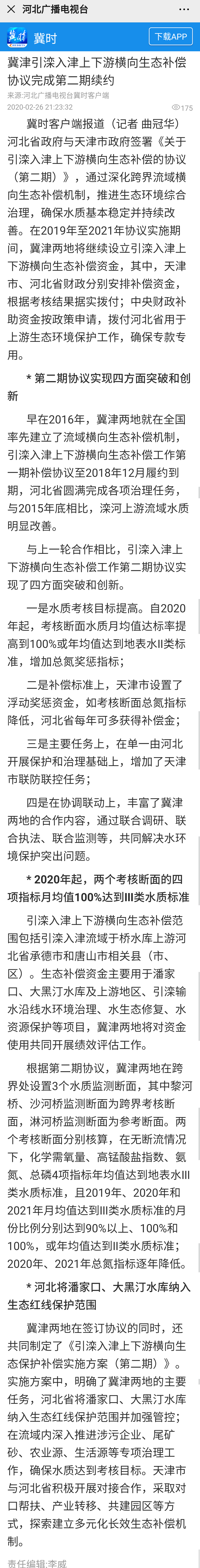 河北广播电视台冀时客户端:冀津引滦入津上下游横向生态补偿协议完成第二期续约