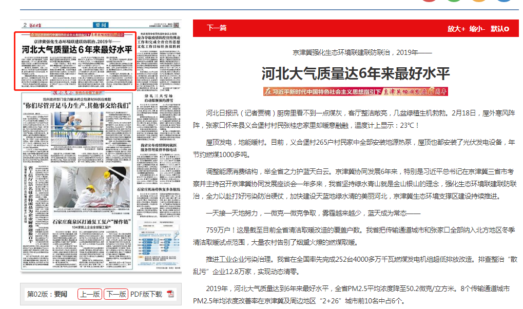 2019年,河北大气质量达到6年来最好水平,全省PM2.5平均浓度降至50.2微克/立方米。8个传输通道城市PM2.5年均浓度改善率在京津冀及周边地区“2+26”城市前10名中占6个。