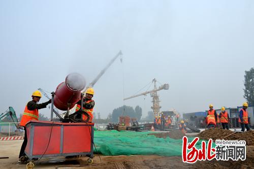 中铁十七局三公司石家庄地铁东庄站施工人员正在使用除尘炮雾机降尘作业。(资料片)