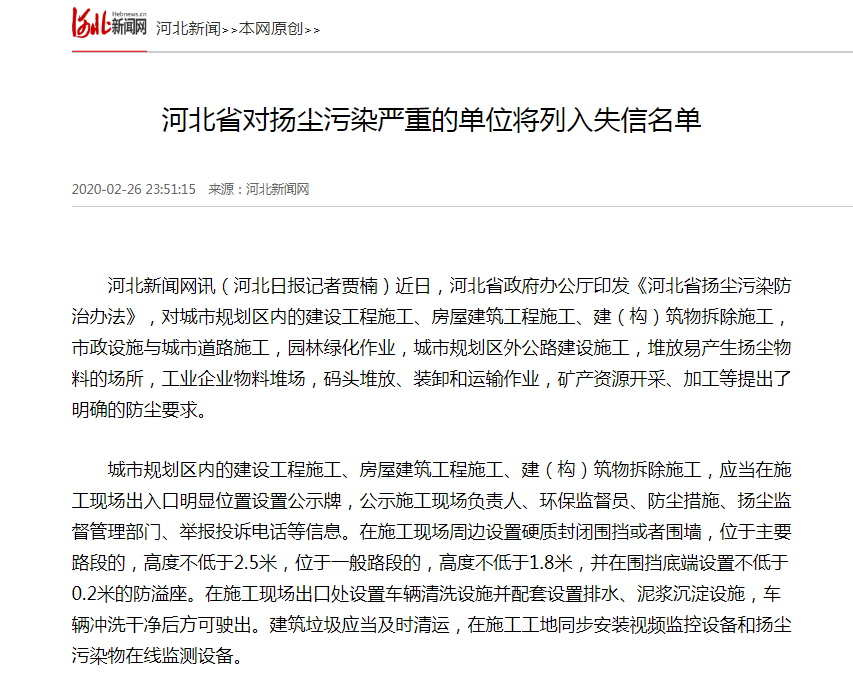 河北新闻网:河北省对扬尘污染严重的单位将列入失信名单
