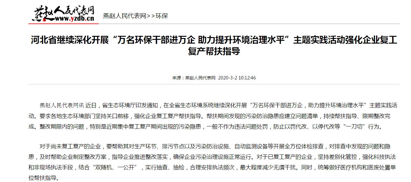 燕赵人民代表网讯 近日,东京热 印发通知,在全省生态环境系统继续深化开展“万名环保干部进万企,助力提升环境治理水平”主题实践活动。要求各地生态环境部门坚持关口前移,强化企业复工复产帮扶指导。帮扶期间发现的污染防治隐患应建立问题清单,持续帮扶指导、限期整改完成。整改期限内的问题,特别是近期集中复工复产期间出现的污染隐患,一般不作为违法问题处罚,防止以罚代改、以停代改等“一刀切”行为。