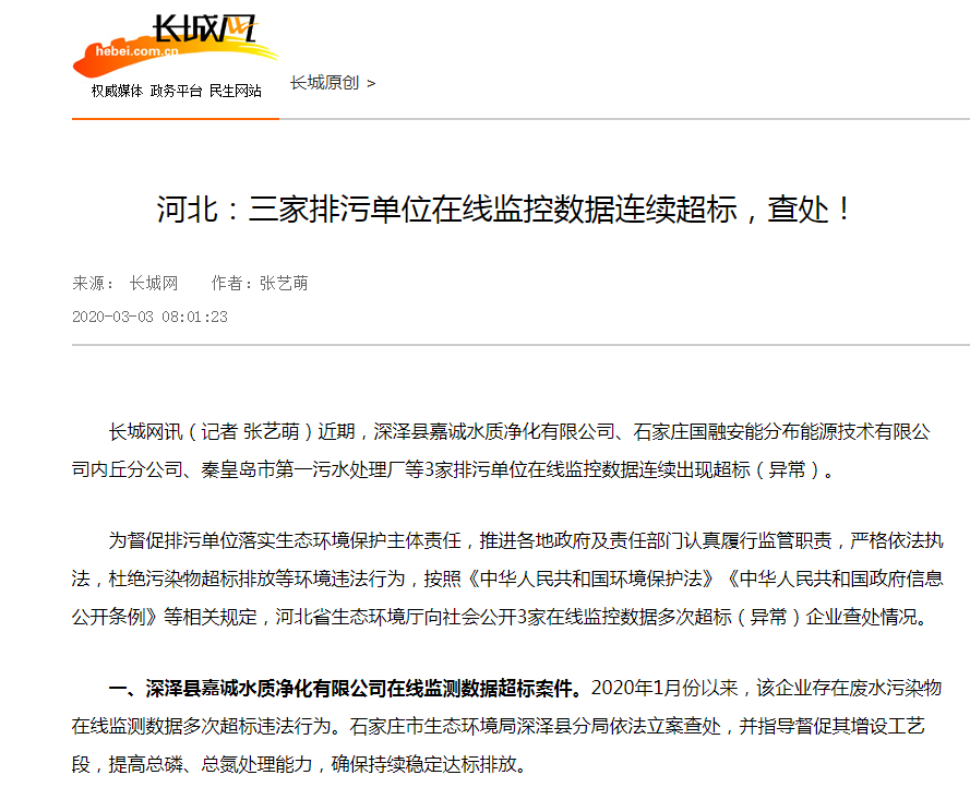 一、深泽县嘉诚水质净化有限公司在线监测数据超标案件。2020年1月份以来,该企业存在废水污染物在线监测数据多次超标违法行为。石家庄市生态环境局深泽县分局依法立案查处,并指导督促其增设工艺段,提高总磷、总氮处理能力,确保持续稳定达标排放。