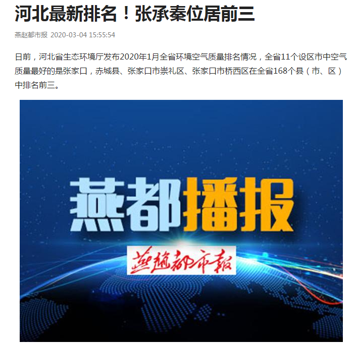 在全省168个县(市、区)中,1月份,按空气质量综合指数由小到大的顺序,前20名县(市、 区)依次是赤城县、张家口市崇礼区、张家口市桥西区、张家口市桥东区、张北县、张家口市万全区、沽源县、康保县、滦平县、怀安县、丰宁满族自治县、兴隆县、承德市双桥区、承德市双滦区、张家口市下花园区、隆化县、尚义县、宽城满族自治县、秦皇岛市北戴河区、承德县 、张家口市宣化区。