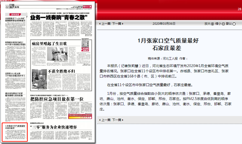 河北工人报:1月张家口空气质量最好 石家庄最差