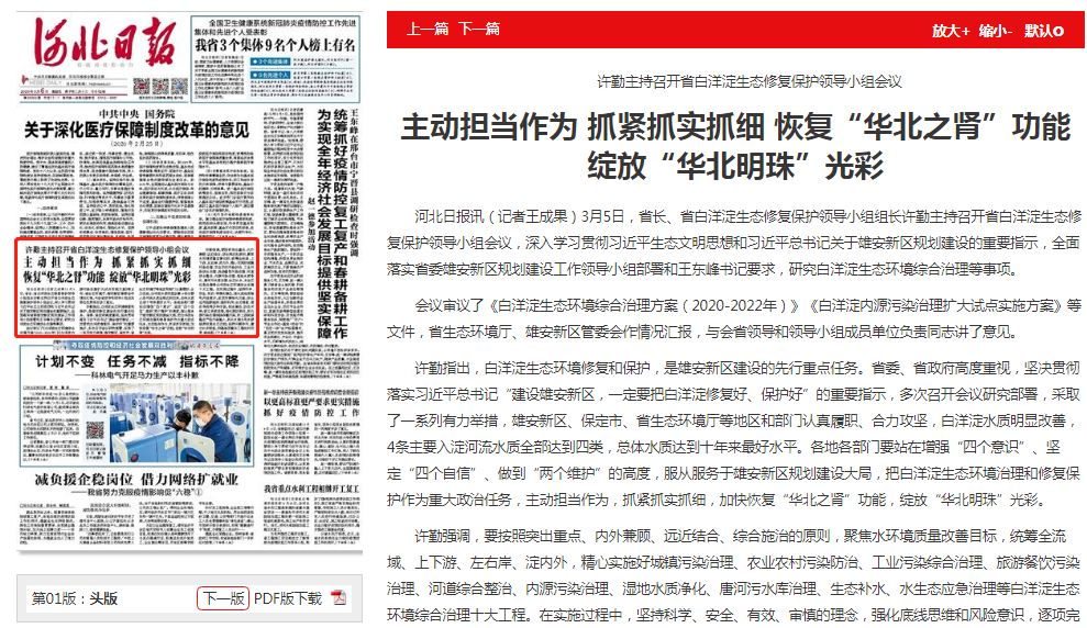 会议审议了《白洋淀生态环境综合治理方案(2020-2022年)》《白洋淀内源污染治理扩大试点实施方案》等文件,东京热 、雄安新区管委会作情况汇报,与会省领导和领导小组成员单位负责同志讲了意见。