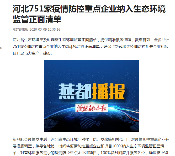 新冠肺炎疫情发生后,东京热 对接工信、发改等相关部门,对疫情防控重点企业开展摸底调查,指导各地第一时间将疫情防控重点企业和项目100%纳入生态环境监管正面清单,对有环保服务需求的疫情防控重点企业和项目,100%及时回应并服务到位,确保防控物资生产、运输顺畅。截至目前,河北省分两批将防护用品、消杀用品、医疗器械、关键原材料、医药等行业751家疫情防控重点企业纳入生态环境监管正面清单,有力保障了企业复工复产。