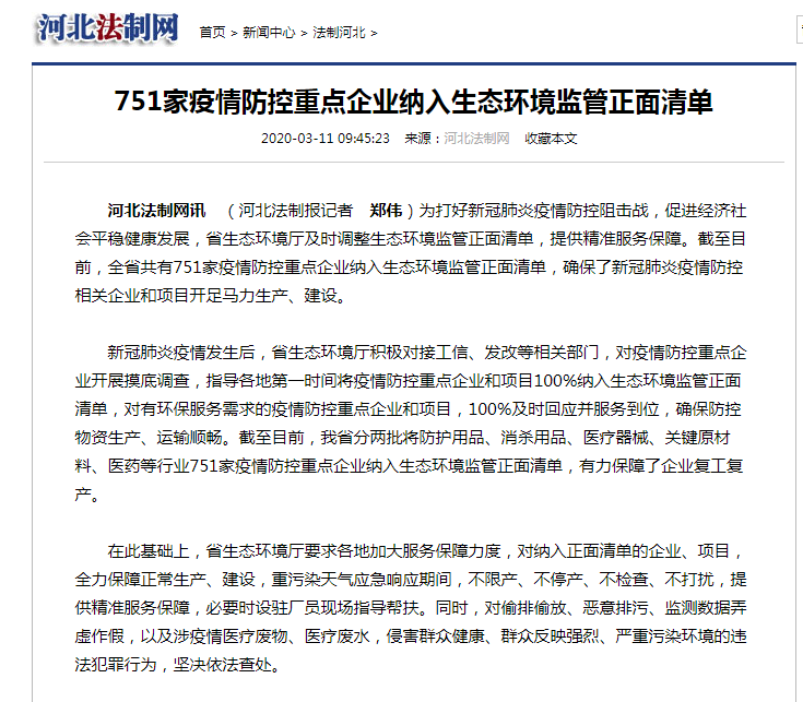 河北法制网 :751家疫情防控重点企业纳入生态环境监管正面清单