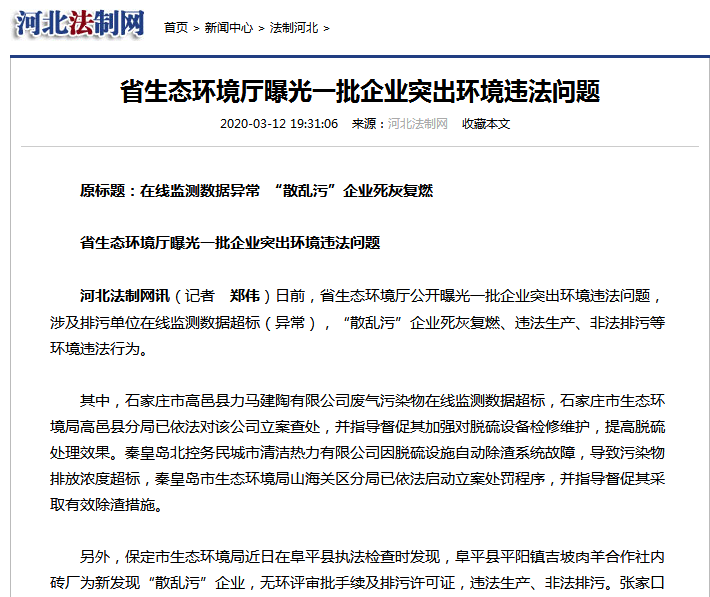 其中,石家庄市高邑县力马建陶有限公司废气污染物在线监测数据超标,石家庄市生态环境局高邑县分局已依法对该公司立案查处,并指导督促其加强对脱硫设备检修维护,提高脱硫处理效果。秦皇岛北控务民城市清洁热力有限公司因脱硫设施自动除渣系统故障,导致污染物排放浓度超标,秦皇岛市生态环境局山海关区分局已依法启动立案处罚程序,并指导督促其采取有效除渣措施。