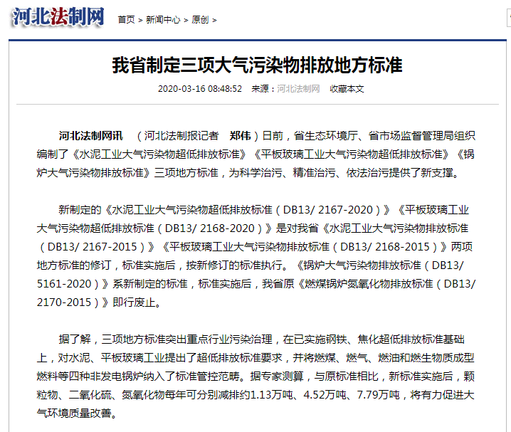 新制定的《水泥工业大气污染物超低排放标准(DB13/ 2167-2020)》《平板玻璃工业大气污染物超低排放标准(DB13/ 2168-2020)》是对我省《水泥工业大气污染物排放标准(DB13/ 2167-2015)》《平板玻璃工业大气污染物排放标准(DB13/ 2168-2015)》两项地方标准的修订,标准实施后,按新修订的标准执行。《锅炉大气污染物排放标准(DB13/ 5161-2020)》系新制定的标准,标准实施后,我省原《燃煤锅炉氮氧化物排放标准(DB13/ 2170-2015)》即行废止。