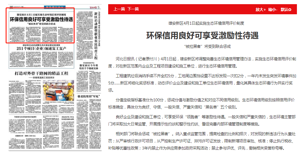 新区将建立完善守信联合激励和失信联合惩戒机制,加快信用体系建设,动态管理生态环境信用评价及信用修复工作,建立新区生态环境信用管理系统,并与全国、省信用信息共享平台互联互通,让“被拉黑者”一处失信、处处受限。
