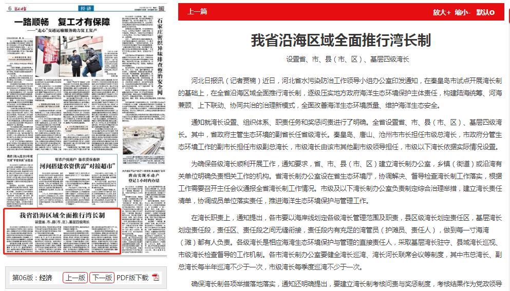 河北日报讯(记者贾楠)近日,河北省水污染防治工作领导小组办公室印发通知,在秦皇岛市试点开展湾长制的基础上,在全省沿海区域全面推行湾长制,逐级压实地方政府海洋生态环境保护主体责任,构建陆海统筹、河海兼顾、上下联动、协同共治的治理新模式,全面改善海洋生态环境质量、维护海洋生态安全。