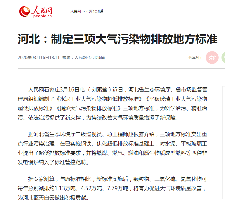 为推进三项标准实施,河北对新建企业和现有企业规定了不同的执行时间,结合行业特点和污染治理设施升级改造实际,预留了合理的治理改造期间。其中,新建企业自2020年5月1日起执行;现有水泥、平板玻璃企业自2021年10月1日起执行新标准,现有锅炉自2021年6月1日起达到新标准排放限值要求。