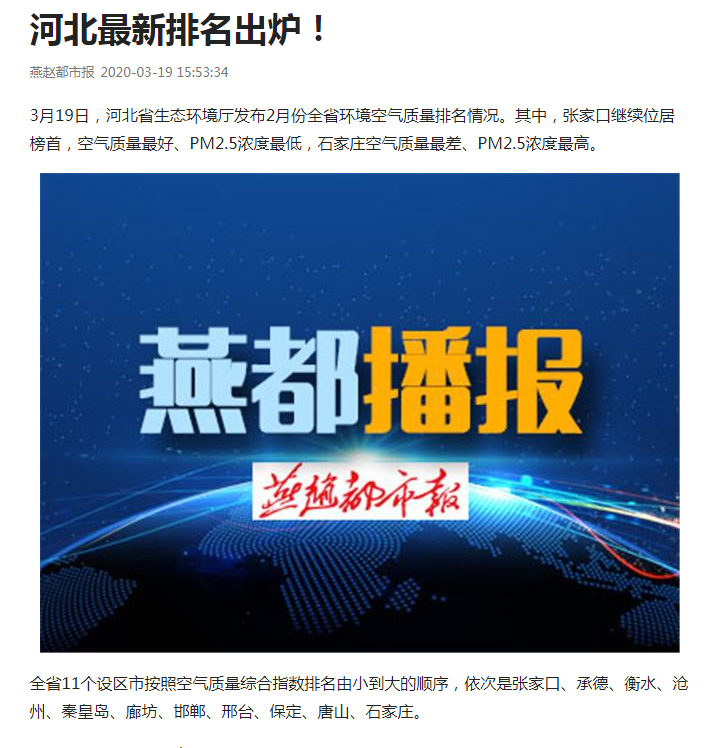 3月19日,东京热 发布2月份全省环境空气质量排名情况。其中,张家口继续位居榜首,空气质量最好、PM2.5浓度最低,石家庄空气质量最差、PM2.5浓度最高。