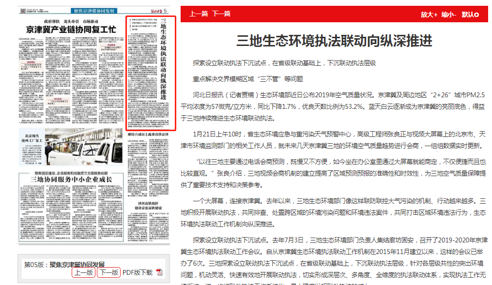 探索设立联动执法下沉试点。去年7月3日,三地生态环境部门负责人集结廊坊固安,召开了2019-2020年京津冀生态环境执法联动工作会议。自从京津冀生态环境执法联动工作机制在2015年11月建立以来,这样的会议已举办了6次。三地探索设立联动执法下沉试点,在省级联动基础上,下沉联动执法层级,针对各层级共性的突出环境问题,机动灵活、快速有效地开展联动执法,切实形成深层次、多角度、全维度的执法联动体系,实现执法工作无缝衔接,进一步将联动执法工作系统化,最大限度发挥联动执法的威力。