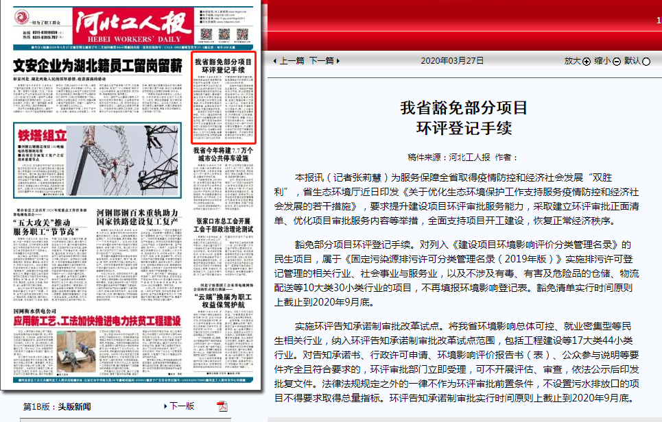 近日印发《关于优化生态环境保护工作支持服务疫情防控和经济社会发展的若干措施》,要求提升建设项目环评审批服务能力,采取建立环评审批正面清单、优化项目审批服务内容等举措,全面支持项目开工建设,恢复正常经济秩序。