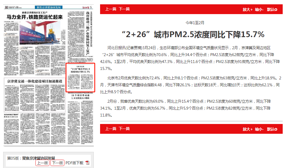 北京市2月优良天数比例为72.4%,同比上升8.1个百分点;PM2.5浓度为63微克/立方米,同比上升18.9%。2月,天津市环境空气质量综合指数4.48,同比下降26.1%;达标天数18天,同比增加3天;达标比例为62.1%,同比上升8.5个百分点。