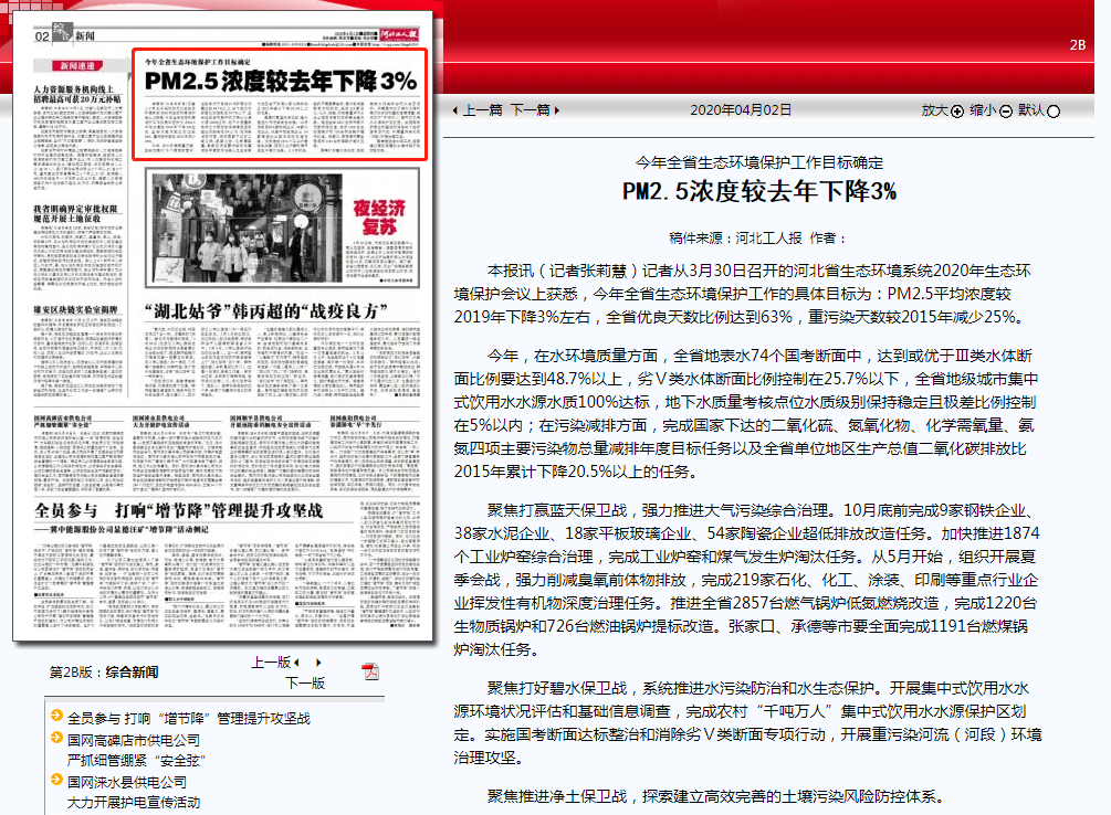 本报讯(记者张莉慧)记者从3月30日召开的河北省生态环境系统2020年生态环境保护会议上获悉,今年全省生态环境保护工作的具体目标为:PM2.5平均浓度较2019年下降3%左右,全省优良天数比例达到63%,重污染天数较2015年减少25%。
