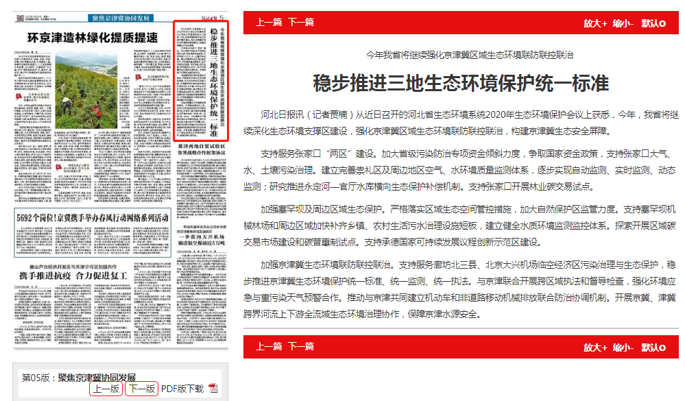 加强京津冀生态环境联防联控联治。支持服务廊坊北三县、北京大兴机场临空经济区污染治理与生态保护,稳步推进京津冀生态环境保护统一标准、统一监测、统一执法。与京津联合开展跨区域执法和督导检查,强化环境应急与重污染天气预警合作。推动与京津共同建立机动车和非道路移动机械排放联合防治协调机制。开展京冀、津冀跨界河流上下游全流域生态环境治理协作,保障京津水源安全。
