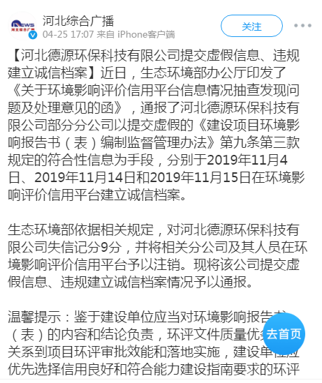 河北综合广播微博:河北德源环保科技有限公司提交虚假信息、违规建立诚信档案