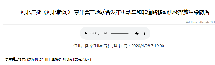 河北广播《河北新闻》:京津冀三地联合发布机动车和非道路移动机械排放污染防治