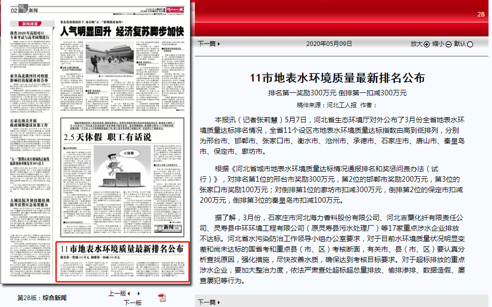 对外公布了3月份全省地表水环境质量达标排名情况,全省11个设区市地表水环境质量达标指数由高到低排列,分别为邢台市、邯郸市、张家口市、衡水市、沧州市、承德市、石家庄市、唐山市、秦皇岛市、保定市、廊坊市。