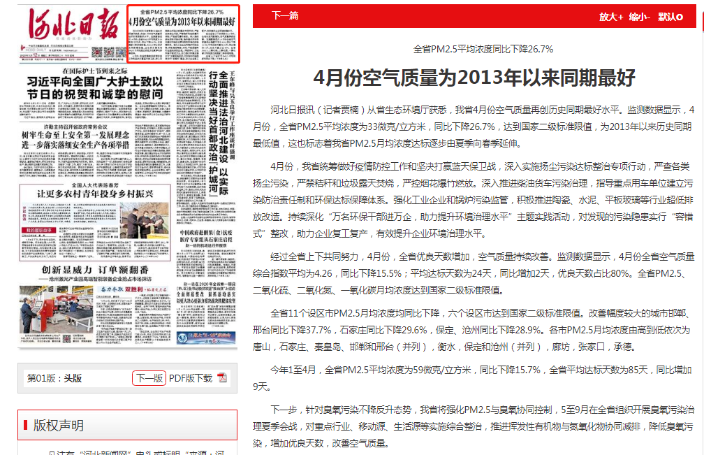 经过全省上下共同努力,4月份,全省优良天数增加,空气质量持续改善。监测数据显示,4月份全省空气质量综合指数平均为4.26,同比下降15.5%;平均达标天数为24天,同比增加2天,优良天数占比80%。全省PM2.5、二氧化硫、二氧化氮、一氧化碳月均浓度达到国家二级标准限值。