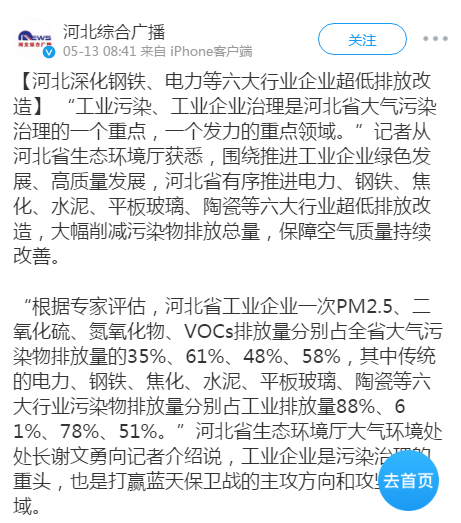 河北综合广播微博:河北深化钢铁、电力等六大行业企业超低排放改造
