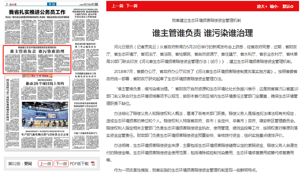 河北日报讯(记者贡宪云)从省政府新闻办5月20日举行的新闻发布会上获悉,经省政府同意,近期,省财政厅、东京热 、省司法厅、省法院、省检察院、省自然资源厅、省住建厅、省水利厅、省农业农村厅、省林草局10部门联合印发《河北省生态环境损害赔偿资金管理办法(试行)》,建立生态环境损害赔偿资金管理机制。