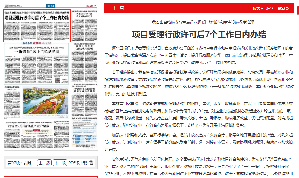 河北日报讯(记者贾楠)近日,省政府办公厅印发《支持重点行业和重点设施超低排放改造(深度治理)的若干措施》,提出我省将深入实施“三创四建”活动,提升行政服务效能,优化审批流程,缩短审批环节和时间,重点行业超低排放改造和重点设施深度治理项目受理行政许可后7个工作日内办结。