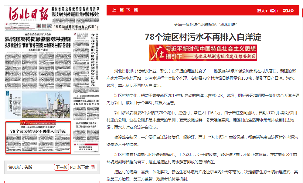 淀区村的变化,得益于雄安新区2019年初启动的白洋淀农村污水、垃圾、厕所等环境问题一体化综合系统治理先行项目。该项目于今年3月底投入运营。