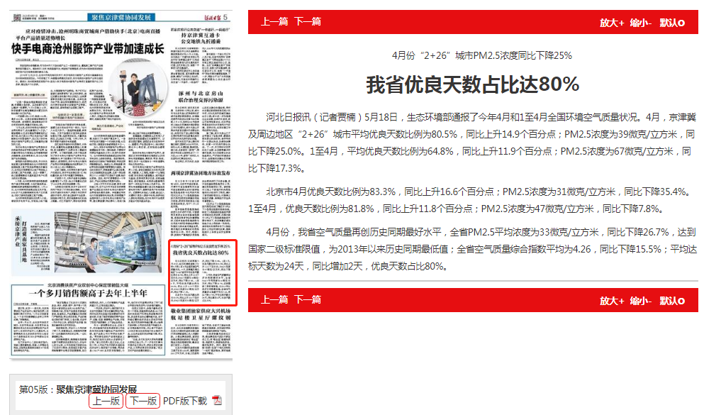 河北日报讯(记者贾楠)5月18日,生态环境部通报了今年4月和1至4月全国环境空气质量状况。4月,京津冀及周边地区“2+26”城市平均优良天数比例为80.5%,同比上升14.9个百分点;PM2.5浓度为39微克/立方米,同比下降25.0%。1至4月,平均优良天数比例为64.8%,同比上升11.9个百分点;PM2.5浓度为67微克/立方米,同比下降17.3%。