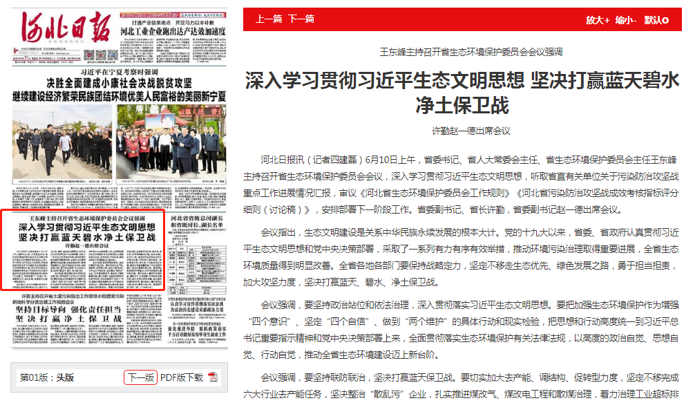 河北日报讯(记者四建磊)6月10日上午,省委书记、省人大常委会主任、省生态环境保护委员会主任王东峰主持召开省生态环境保护委员会会议,深入学习贯彻习近平生态文明思想,听取省直有关单位关于污染防治攻坚战重点工作进展情况汇报,审议《河北省生态环境保护委员会工作规则》《河北省污染防治攻坚战成效考核指标评分细则(讨论稿)》,安排部署下一阶段工作。省委副书记、省长许勤,省委副书记赵一德出席会议。
