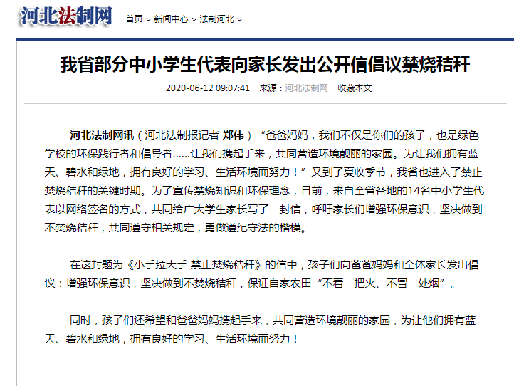 河北法制网:我省部分中小学生代表向家长发出公开信倡议禁烧秸秆
