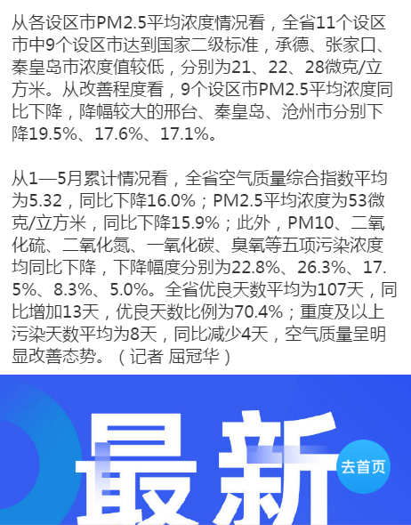 燕赵都市报:5月河北六项大气污染物浓度均同比下降