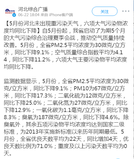 河北综合广播微博:5月份河北未出现重污染天气,六项大气污染物浓度均同比下降