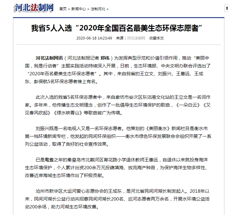 河北法制网:我省5人入选“2020年全国百名最美生态环保志愿者”