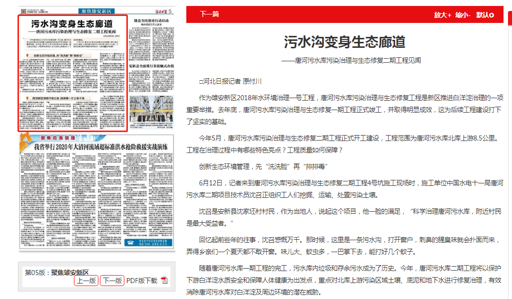 雄安新区管委会相关负责人表示,新区将坚持科学、安全、有效、审慎理念,在巩固唐河污水库一期工程治理成果基础上,结合防洪规划要求,综合考虑防洪、治污、生态教育示范、休憩等功能要求,深入推进实施二期治理工程,打造受污染河渠治理的“雄安样板”。