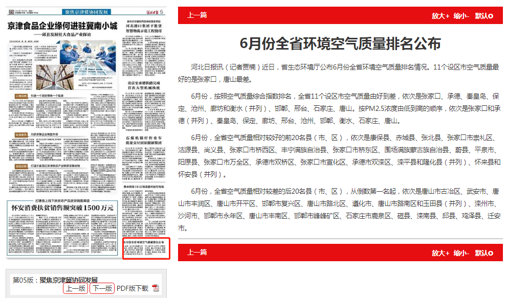 6月份,按照空气质量综合指数排名,全省11个设区市空气质量由好到差,依次是张家口、承德、秦皇岛、保定、沧州、廊坊和衡水(并列)、邯郸、邢台、石家庄、唐山。按PM2.5浓度由低到高的顺序,依次是张家口和承德(并列)、秦皇岛、保定、廊坊、邢台、沧州、邯郸、衡水、石家庄、唐山。