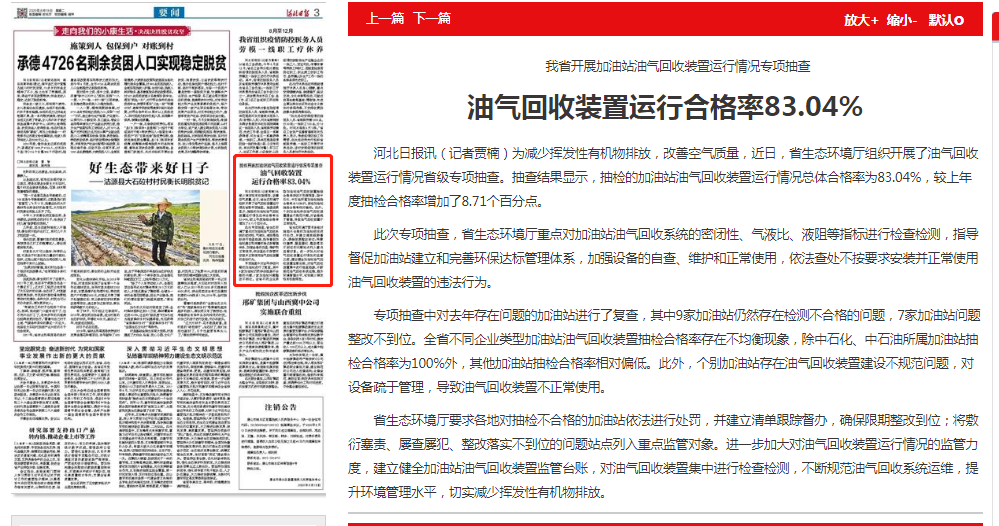 河北日报讯(记者贾楠)为减少挥发性有机物排放,改善空气质量,近日,东京热 组织开展了油气回收装置运行情况省级专项抽查。抽查结果显示,抽检的加油站油气回收装置运行情况总体合格率为83.04%,较上年度抽检合格率增加了8.71个百分点。