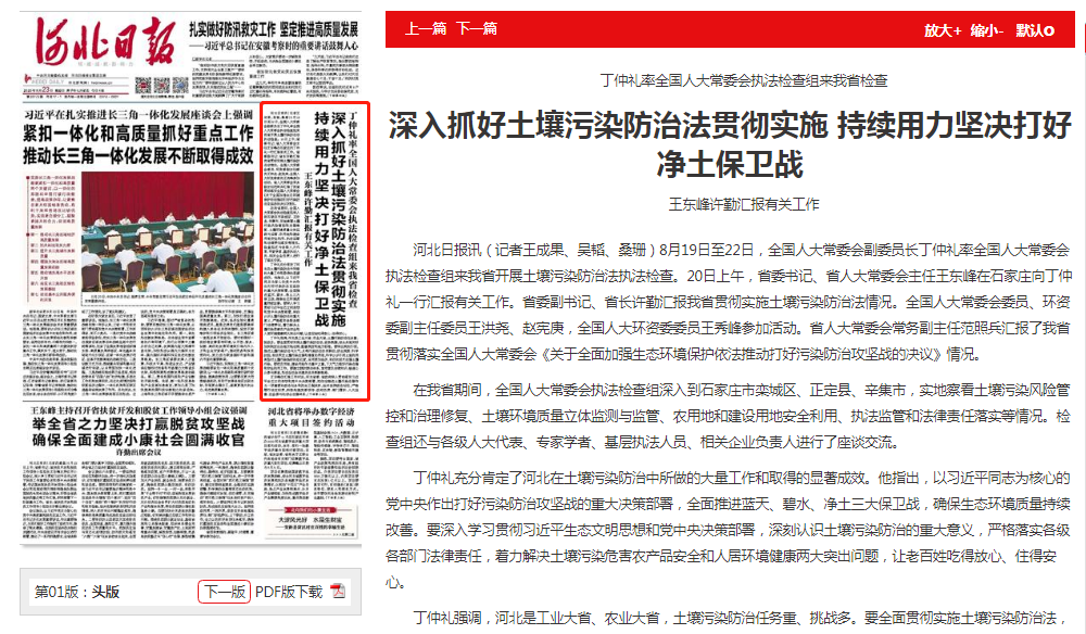 丁仲礼强调,河北是工业大省、农业大省,土壤污染防治任务重、挑战多。要全面贯彻实施土壤污染防治法,逐条梳理,结合本地实际加快制定出台地方性法规、配套规定和地方标准。要突出规划引领,推进土壤污染防治与大气、水等污染防治协同联动,综合施策、科学防控,有效界定土壤污染治理和修复的界限,科学认识不同土地利用类型对土壤污染指标的容忍度,采用更加经济、有效的技术治理土壤污染。要把农用地、建设用地作为重中之重,下大气力做好污染治理和安全利用工作。要建立群防群治体系,宣传普及法律知识,畅通公众参与渠道,形成全社会共建共治共享新格局。