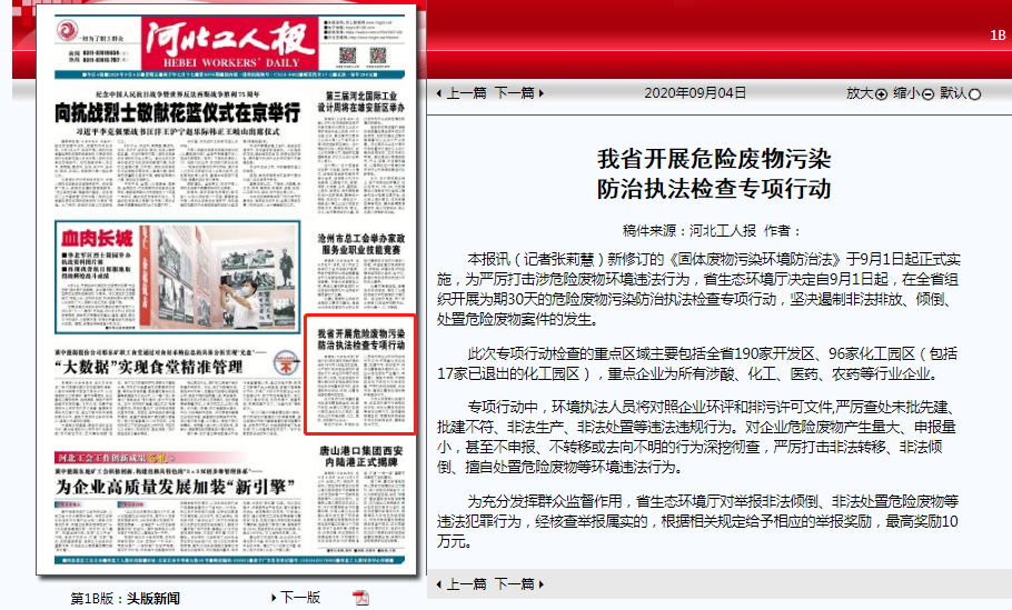 决定自9月1日起,在全省组织开展为期30天的危险废物污染防治执法检查专项行动,坚决遏制非法排放、倾倒、处置危险废物案件的发生。