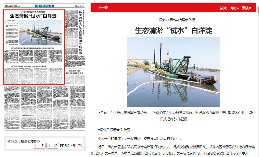 2019年,雄安新区在多次论证基础上,选择在安新县采蒲台村和南刘庄村2个代表性区域开展底泥内源污染治理试点(一期)。此后,新区委托中科院生态环境研究中心开展了专题研究,并组织编制《2020年白洋淀内源污染治理扩大试点实施方案》,根本任务是协同推进内源污染治理、生态本底修复和水动力改善,从而全面完成白洋淀规划中关于生态清淤试点要求。