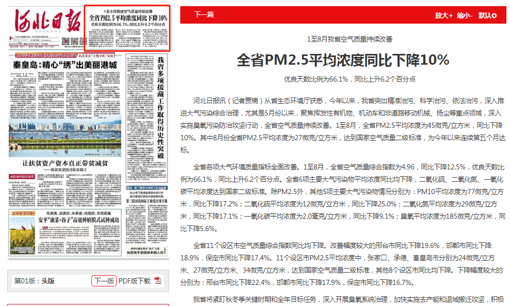 全省11个设区市空气质量综合指数同比均下降。改善幅度较大的邢台市同比下降19.6%,邯郸市同比下降18.9%,保定市同比下降17.4%。11个设区市PM2.5平均浓度中,张家口、承德、秦皇岛市分别为24微克/立方米、27微克/立方米、34微克/立方米,达到国家空气质量二级标准,其他8个设区市同比均下降。下降幅度较大的分别为:邢台市同比下降22.4%,邯郸市同比下降17.9%,保定市同比下降16.7%。