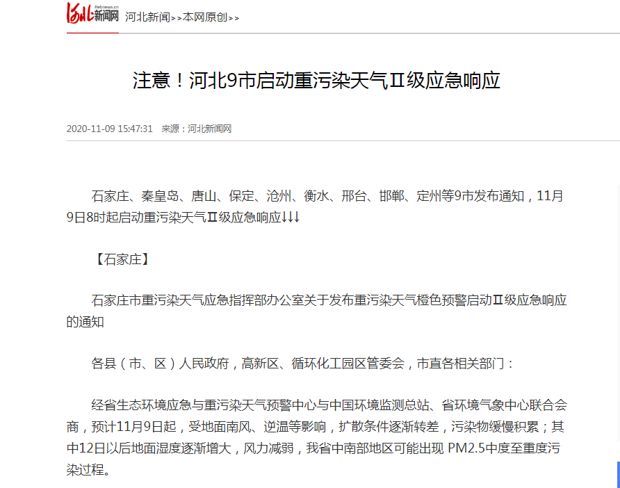 石家庄、秦皇岛、唐山、保定、沧州、衡水、邢台、邯郸、定州等9市发布通知,11月9日8时起启动重污染天气Ⅱ级应急响应↓↓↓