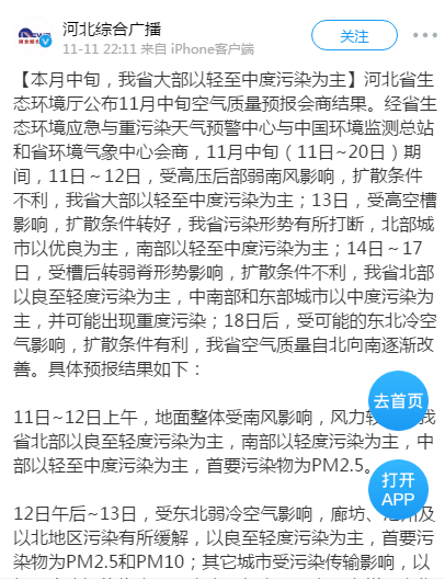 河北综合广播微博:本月中旬,我省大部以轻至中度污染为主