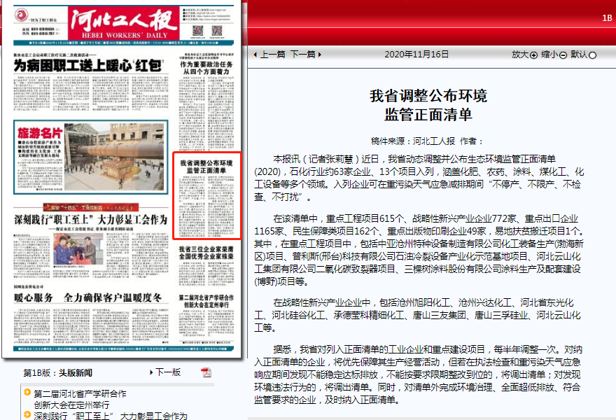 本报讯(记者张莉慧)近日,我省动态调整并公布生态环境监管正面清单(2020),石化行业约63家企业、13个项目入列,涵盖化肥、农药、涂料、煤化工、化工设备等多个领域。入列企业可在重污染天气应急减排期间“不停产、不限产、不检查、不打扰”。